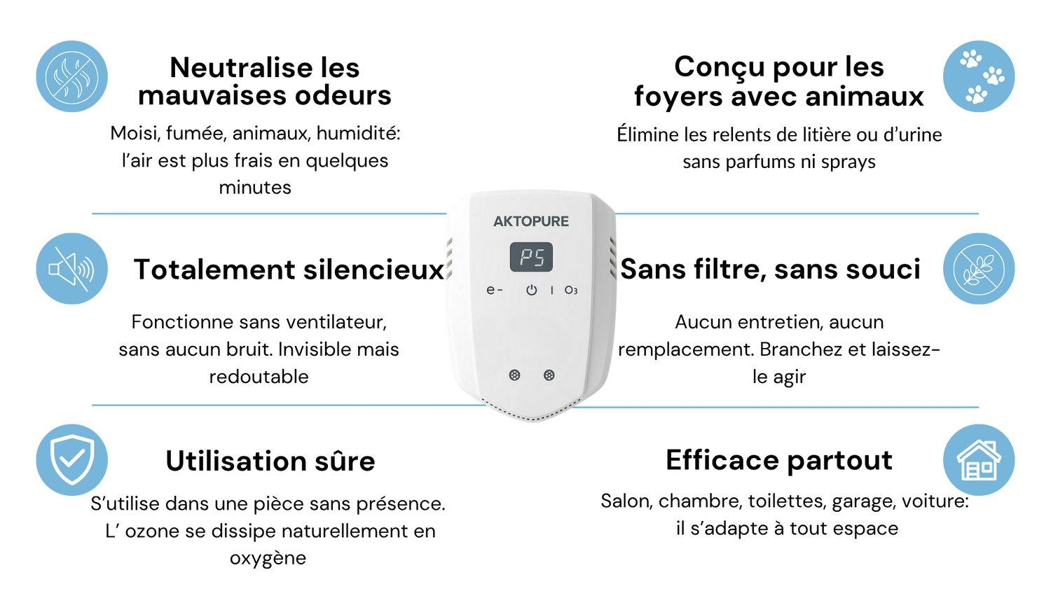 Pendant quelques minutes, Aktopure™️ libère une petite quantité d’ozone et émet des ions négatifs.
